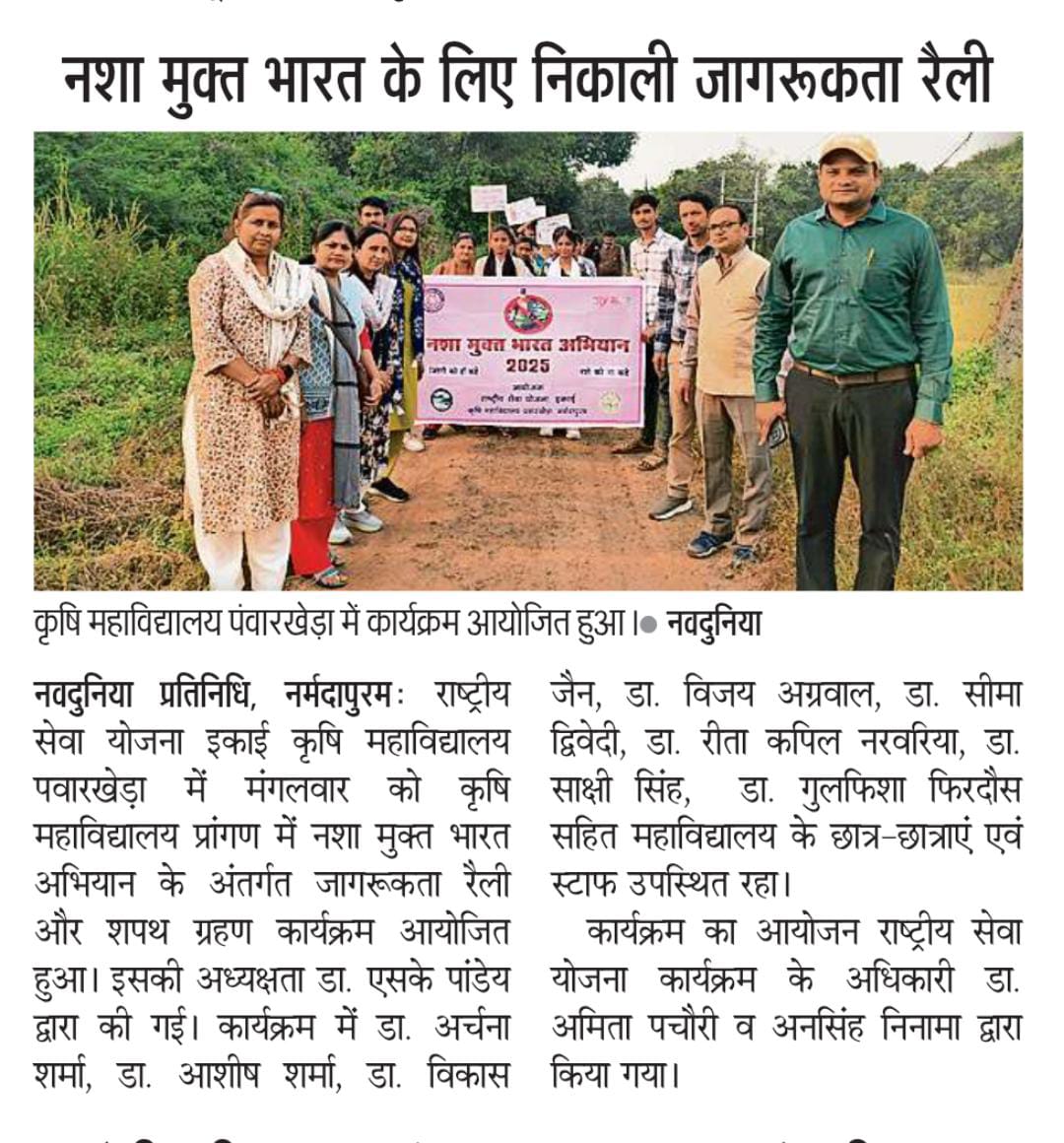 राष्ट्रीय सेवा योजना इकाई कृषि महाविद्यालय पवारखेड़ा, नर्मदापुरम द्वारा कृषि महाविद्यालय प्रांगण में नशा मुक्त भारत अभियान के अंतर्गत रैली तथा शपथ ग्रहण कार्यक्रम का आयोजन किया गया ।