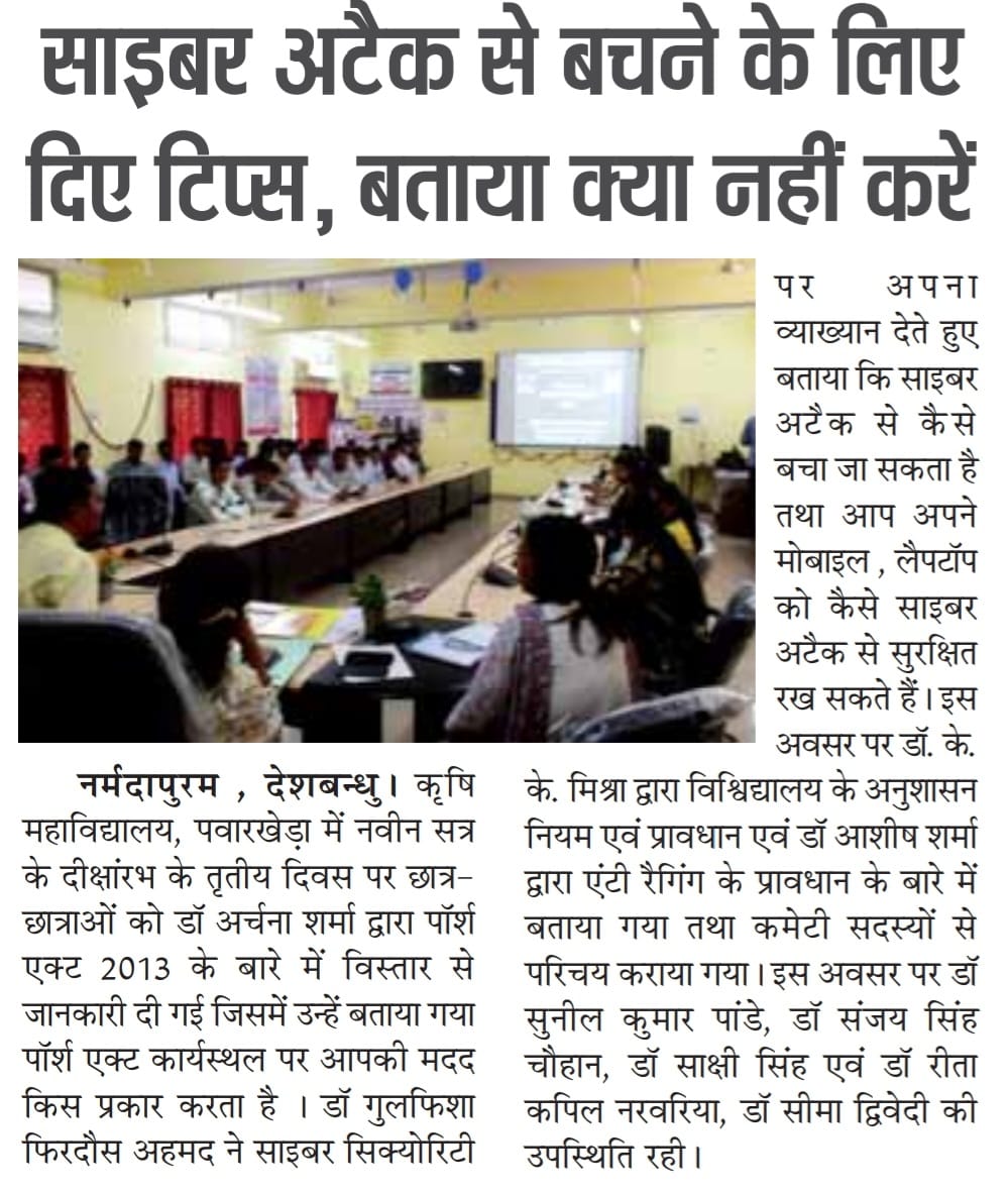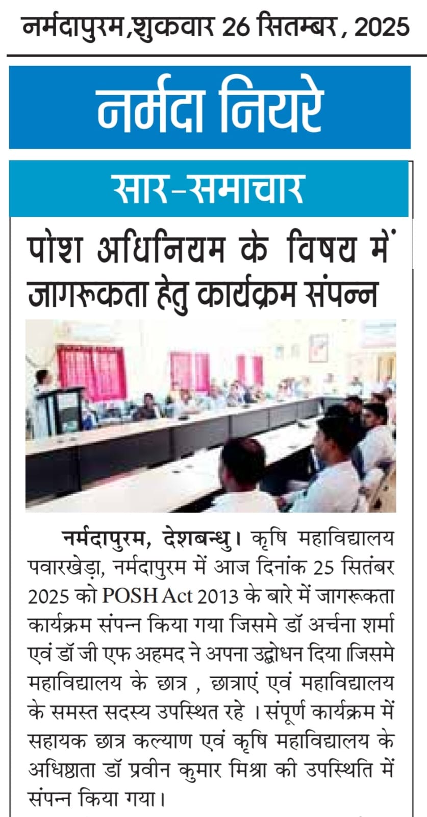 College of Agriculture Powarkheda, Narmadapuram, organised ,Awareness Programme on Posh Act -2013 on 25.09.2025
