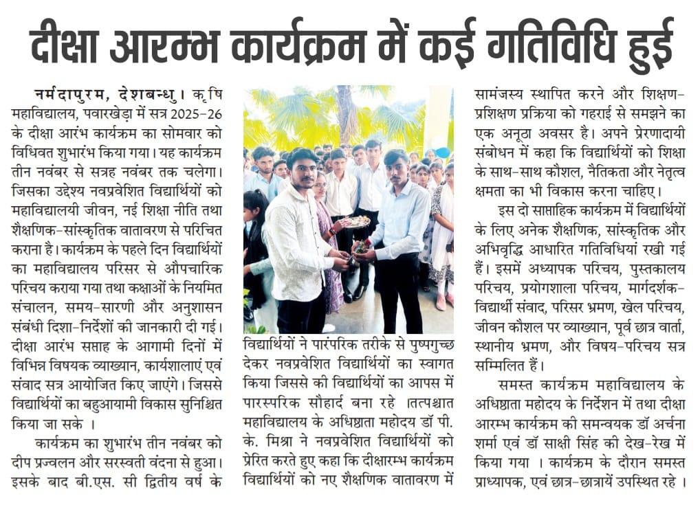 कृषि महाविद्यालय, पवारखेड़ा में सत्र 2025-26 के दीक्षा आरंभ कार्यक्रम का सोमवार को विधिवत शुभारंभ किया गया।