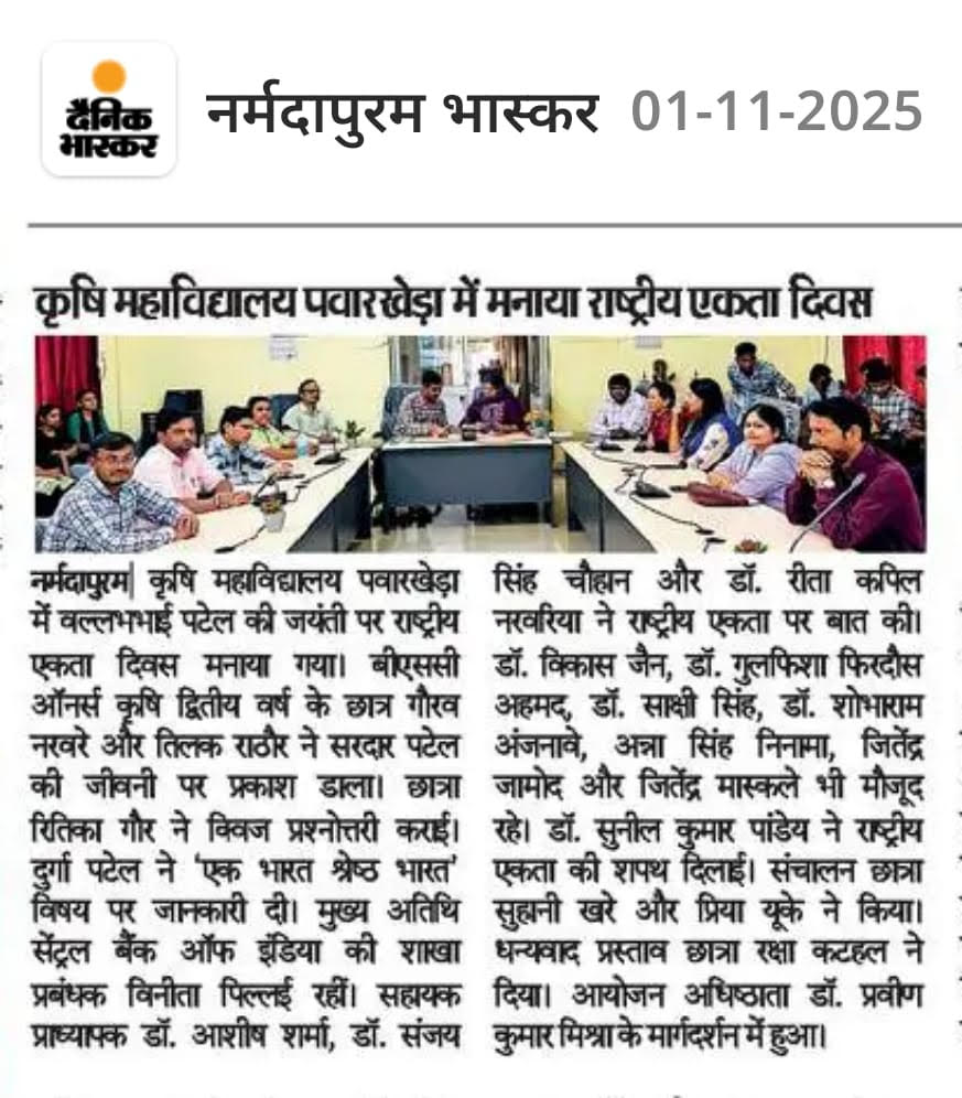 आज दिनांक 31 अक्टूबर 2025 को कृषि महाविद्यालय, पवारखेड़ा के सभागार में एक भारत श्रेष्ठ भारत के अंतर्गत *राष्ट्रीय एकता दिवस मनाया गया* ।