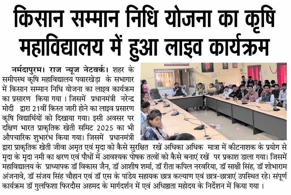 19 नवंबर 2025 को कृषि महाविद्यालय पवारखेड़ा नर्मदापुरम के सभागार में किसान सम्मान निधि योजना का लाइव कार्यक्रम का प्रसारण किया गया ।